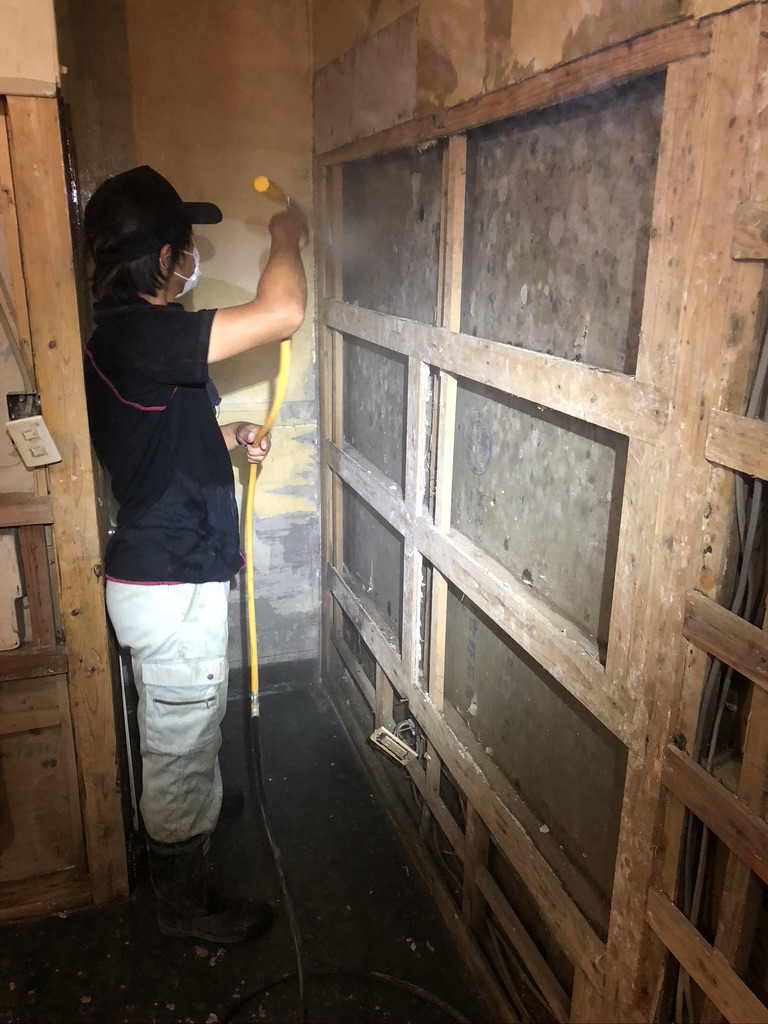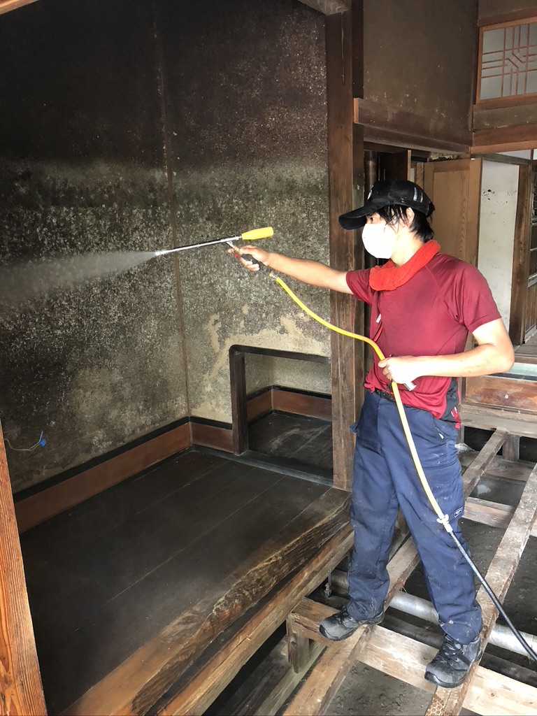 To treat the moldy walls and columns, they washed off the mold and dry them completely.