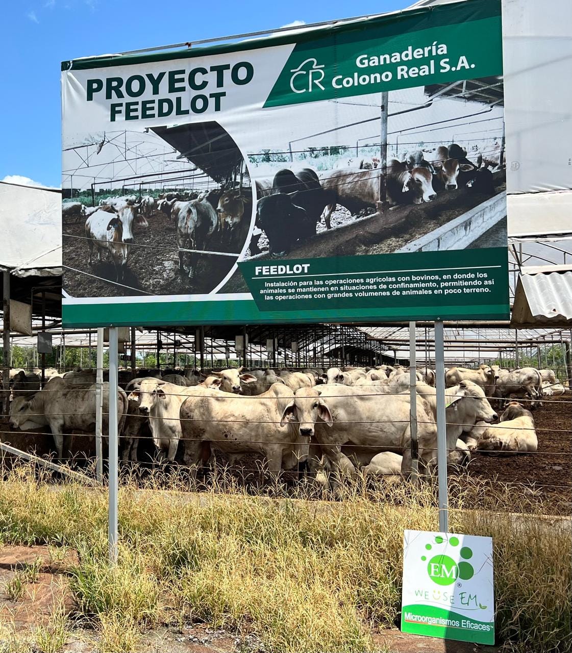 The Ganadería Colono Real S.A. farm has 2000-2200 cattle in its feedlot and is known as a producer of the gray Brahman breed. They have been working with EM technology for about 6 years (as of 2024) and it has helped them to control odors and produce organic fertilizer from animal manure in a sustainable way.