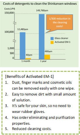 The Shinkansen (bullet train) is a world-class Japanese technology and EM is used to clean the inside and outside of these trains. According to the Morioka office of the JR Morioka Railway Service, they clean, inspect, fix, collect, separate garbage for the Tohoku Shinkansen, running between Tokyo and Aomori.
