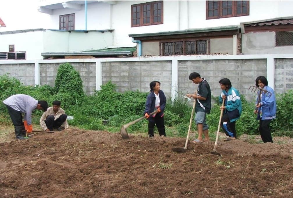 Kitchen waste is mixed with EM Bokashi to make compost. Using this compost, soil is prepared for vegetable garden. Some of the vegetables grown here are used in the hospital dining room.
