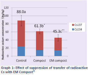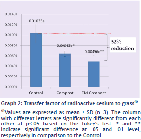 The sum of 134Cs and 137Cs in the grass was 88Bq/kg in the Control, 61.3Bq/kg in the Compost area and 45.3Bq/kg in the EM Compost area.