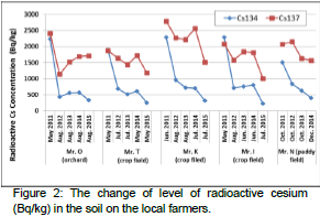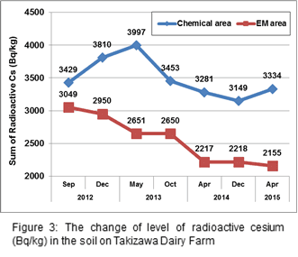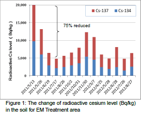 Radioactive cesium level of the soil in EM Treatment area was approx.20,000Bq/kg at the beginning of the experiment and was dropped to approx. 5,000Bq/kg in Julym which means that there was approx. 15,000Bq/kg '75%) reduction in 2 months ater spraying AEM. Also, EM+OM area had a decrease of radioactive cesium level (Figure1).