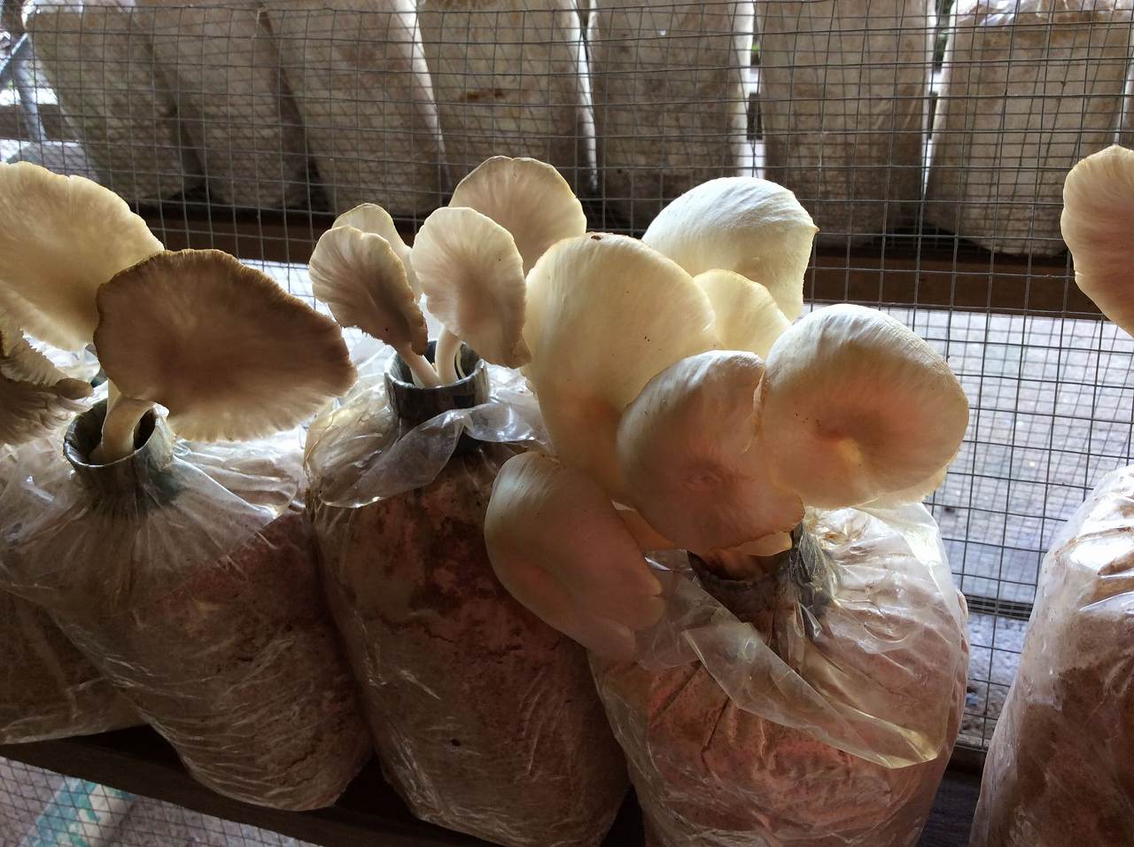 They mix sawdust, rice bran, lime, gypsum, rock phosphate, water, EM・1 and molasses to make the substrate. The fermented mixture is put into plastic bags in anaerobic condition and the cultivation of the mycelia is carefully deposit in each bag. Mushrooms are growing healthy and are sprayed with Activated EM for sanitary control.