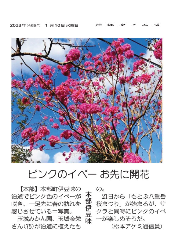 Pink Ipe is blooming along roadside in Izumi, Motobu Town, a step ahead of other flowers, reminding us that spring has come. (See photo) This Ipe tree was planted along the roadside by Mr. Kinei Tamaki, 75, of Tamaki Mandarin Orange Orchard. The Motobu Yaedake Cherry Blossom Festival will start on the 21st, and visitors can enjoy the pink Ipe along with the cherry blossoms.