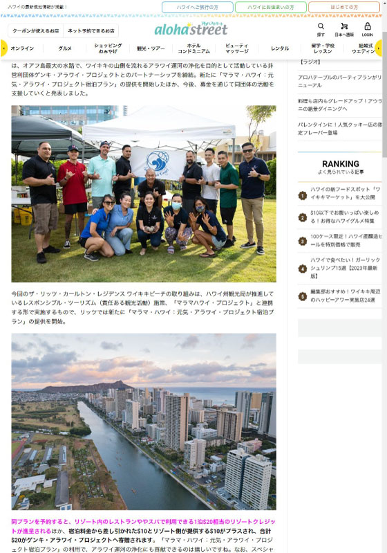 A high-rise hotel condominium in Waikiki, The Ritz-Carlton Residences Waikiki Beach, has partnered with the Genki Ala Wai Project, a non-profit organization working to clean up the Ala Wai Canal, which runs along the mountain side of Waikiki and is the largest waterway on Oahu. In addition to newly offering the Marama Hawaii: Genki Ala Wai Project Accomodation Plan, they announced that they will support the activities of the organization through donations.