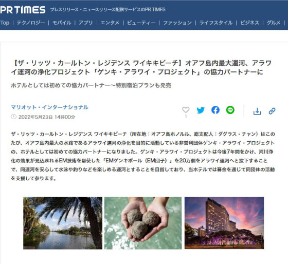The Ritz-Carlton Residences Waikiki Beach (Honolulu, Oahu; Douglas Chan, General Manager) has become the first hotel to partner with the “Genki Ala Wai Project,” a non-profit organization dedicated to cleaning up the Ala Wai Canal, the largest waterway on the island of Oahu. The Genki Ala Wai Project aims to make the Ala Wai Canal safe for swimming and fishing by tossing in some 200,000 EM Genki Balls (EM bokashi mud balls) into the canal over the next seven years. The expectation is that EM technology will help in bioremediation and in revitalizing the canal. The hotel will support the organization’s activities through fundraising.
