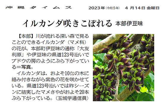 Grape-like clusters of Irukanda (leguminous) flowers are found in the deep forest where the Motobu River flows, in Izumi, Motobu Town, commonly known as Otomo Rigen, and also along Prefectural Road 123 in Izumi, Motobu Town (see photo). Irukanda are purple flowers that wrap around the 10 meter high tree. Along Prefectural Route 123, about 20 bean pods that bore fruit last season are hanging down. (Reported by Manabu Tamaki)