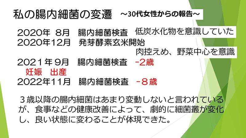 Although it is said that intestinal bacteria do not change much after one is three years old, changes in diet, etc. allowed me to experience a dramatic change in intestinal microflora, leading to an improvement in physical condition.