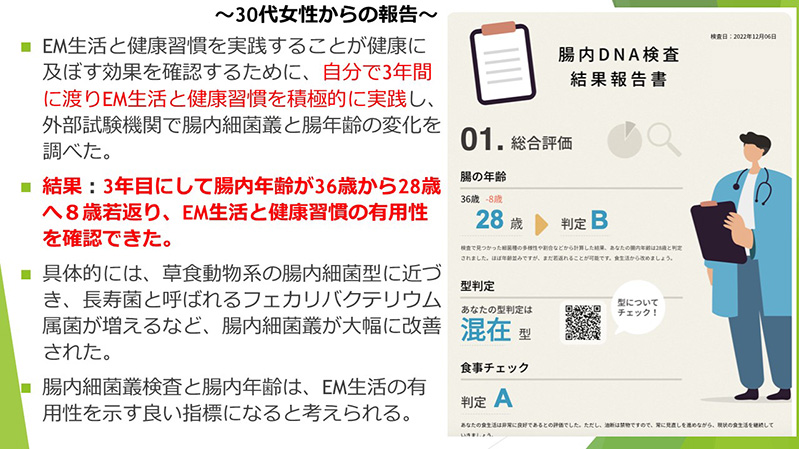 • In order to confirm the effects on health of practicing the EM lifestyle and healthy habits, she actively practiced the EM lifestyle and healthy habits for three years, and then had the changes in intestinal microflora and intestinal age examined at an external testing institute.