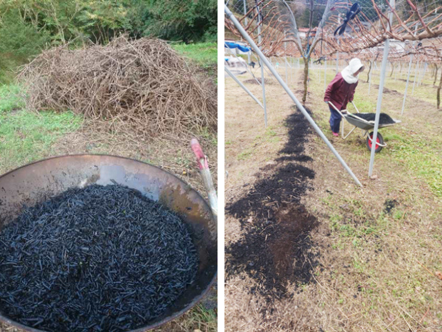 I started making EM charcoal last year and spread it on the surface after harvest. This summer was extremely hot even in the highlands, but the inside of the greenhouses with the grapevine trellises were comfortable and moist. We were able to make it with just four women worker cultivators, whose average age was just under 70. Spreading EM charcoal on the surface seems to be effective in mitigating a rapid rise in temperature.