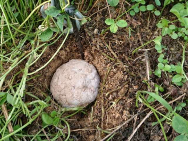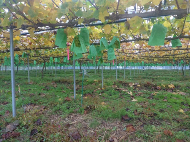 We cover our grapes with bags at the end of July every year to protect them from pests, and then harvest them out of season from October to the end of November. We place activated EM in plastic bottles every 2 meters and bury EM bokashi balls in the ground every meter to enclose the orchard. This year we had no bird or animal damage, though a badger that entered through the drainage pipe did eat some grapes.