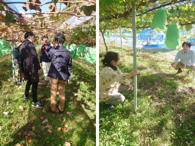 Many people visit us to see the actual grapes growing until the end of November. We've had frost since the end of October, and the leaves have already fallen, but the Shine Muscat grapes are still green. Famous pastry chefs from Hiroshima and other places tour our orchard to get ideas for future product development.