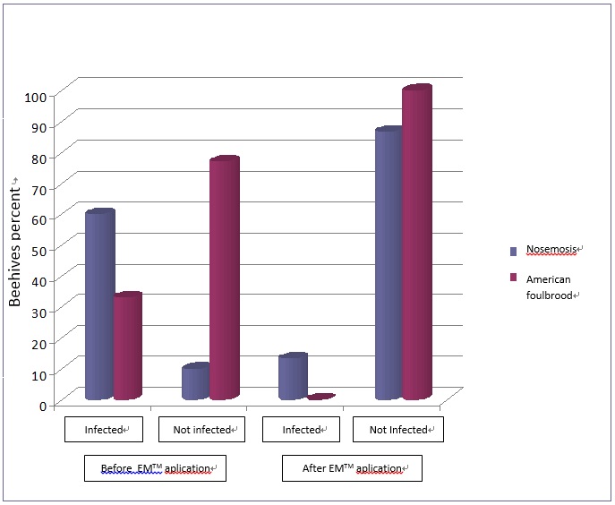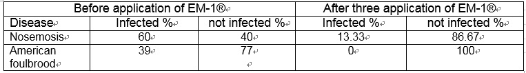 – Before EM・1 application, the apiary was infected with Nosemosis by 60% in high levels and American foulbrood by 33%.