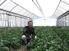 Mr. Ishii inside the lettuce greenhouse