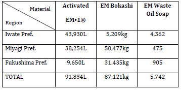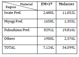 EM Materials Applied EM Support Project Team for Tsunami Reconstruction has received EM-related materials such as AEM•1 (Activated EM•1, also known as EMAS) and EM Bokashi from EM volunteers around the country. The NPO Group U-Net has assisted the carriage of these materials for using at the affected areas. The materials received from throughout the country as of October 2013 are: