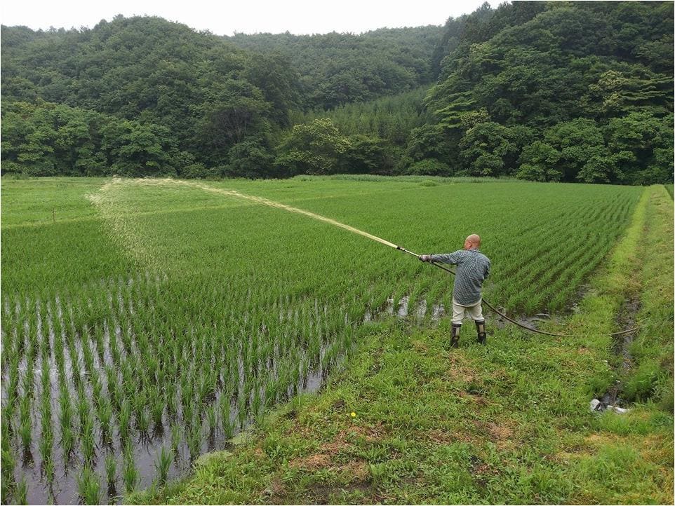Well-tanned Mr. Imaizumi and Mr. Yonekura of Cosmo Farm, Tamura City in Fukushima Prefecture, are busy with making rice paddies these days while being energetically involved in decontamination activities. It looks that soil is already in good condition, and they are spraying Activated EM•1 over it on regular basis. The east side of Miyakoji-machi, where Mr. Imaizumi resides, locates within 20km from the nuclear plant, and thus, is appointed as “cultivation-prohibited area.” Of course, their rice paddies are more than 20km away from the plant, however, they have to use cesium countermeasure material and chemical fertilizer to make soil, unlike the other area.