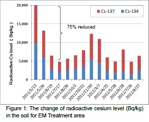 Report on an experiment conducted on contaminated farmland in Fukushima. Find out the difference in decline of cesium levels in EM treated area.
