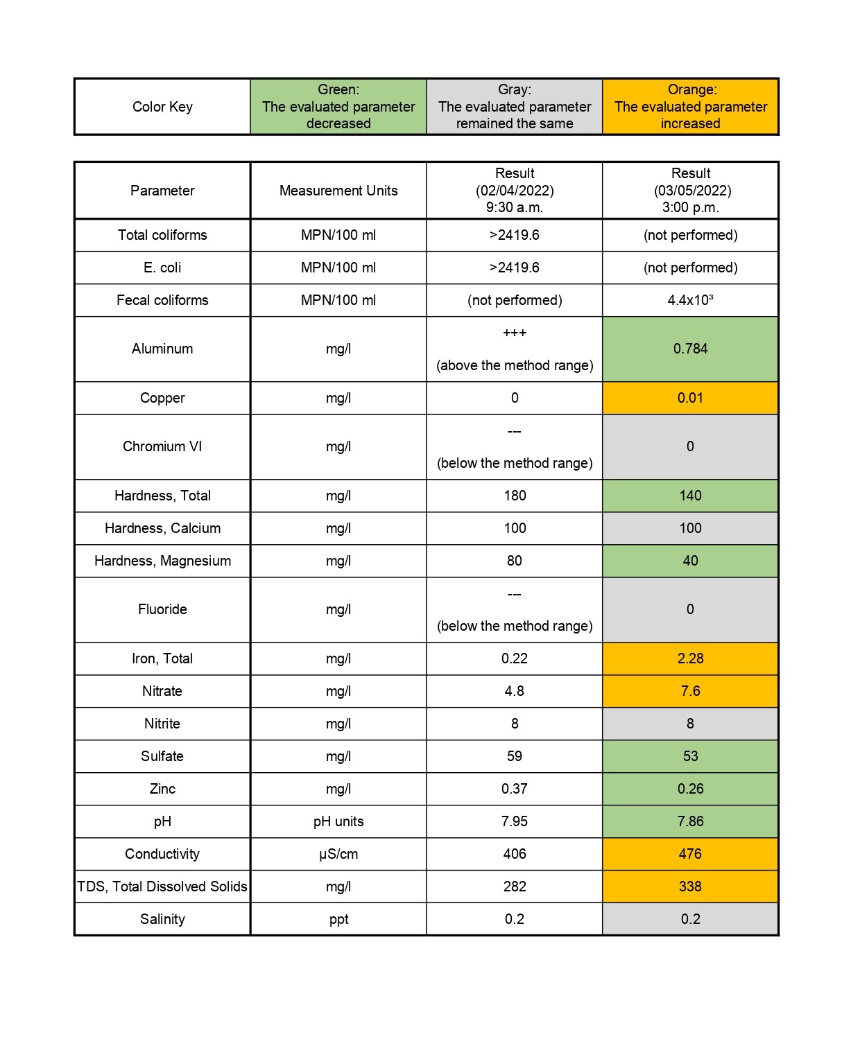 Bacteriological parameters, dissolved solids, nitrites, nitrates, sulfates and others may vary due to the specific conditions of the discharges received by the river at the time of sampling, as it is known that the river receives discharges from upstream. Beyond the results presented above, further monitoring and additional analysis is required as this project is ongoing.