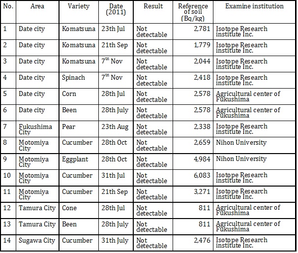 The application of EM and tests continued from spring to autumn 2012 in the experimental field of Iitate town, but radioactive Cs concentration remained at 5,000-8,000 Bq /kg. In 2013, the government of Iitate town started the decontamination project officially, so we suspended this study and test.
