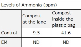 Compared to the compost produced in conventional ways, EM compost has no bad odors. When they checked the ammonia level in EM compost in the compost lane and inside the containers, ammonia was not detected at all.