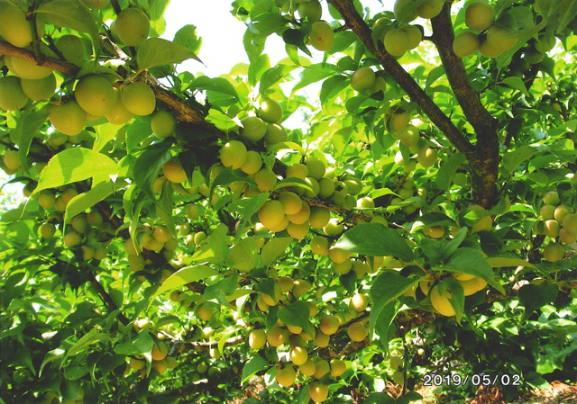 ・I planted Koume (small size Ume plums) and harvested only around 1 kg of them, so I received instructions on how to improve pruning the tree from a person I met at the Okinawa training session. By using rice husk charcoal and a little salt and activated EM with seawater, I was surprised at the yield of 7 kg from one tree last year, 2018, and achieved a yield of 15 kg this year. It seemed like all the flowers that bloomed turned to fruit, and I was able to harvest the plums by grabbing many at once off the branches, using the palm of my hand. The height of the tree is about 1.5m, so that I can stand and grab them off the branches at shoulder height. The tree is planted in an area of about 1 tsubo (3.3 m2)