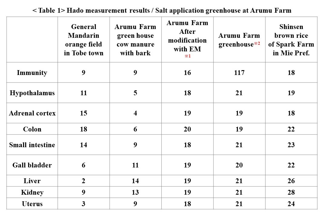 Table 1 shows the hado measurements regarding the health of the soil in which EM is applied, obtained through the cooperation of Mr. Nomoto of Matsuyama City, who is an EM goodwill ambassador.