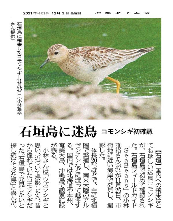 The migratory common snipe, which very rarely flies to Japan, was sighted for the first time on Ishigaki Island in Okinawa. Mr. Masahiro Kobayashi, 47, of the Ishigaki Island field guide shop “SeaBeans,” found and photographed the bird at a beach near the city center on November 25th. This variety of bird is about 20 centimeters in length and breeds mainly in the Arctic Circle before migrating to Argentina and other parts of South America for the winter. In Japan, there are recorded sightings in Hokkaido, Honshu, Amami Oshima and Okinawa Island.