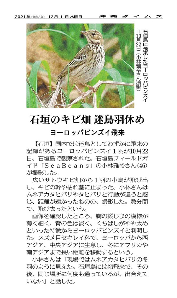 The arrival of a tree pipit December 1, 2021 (Courtesy of Okinawa Times)