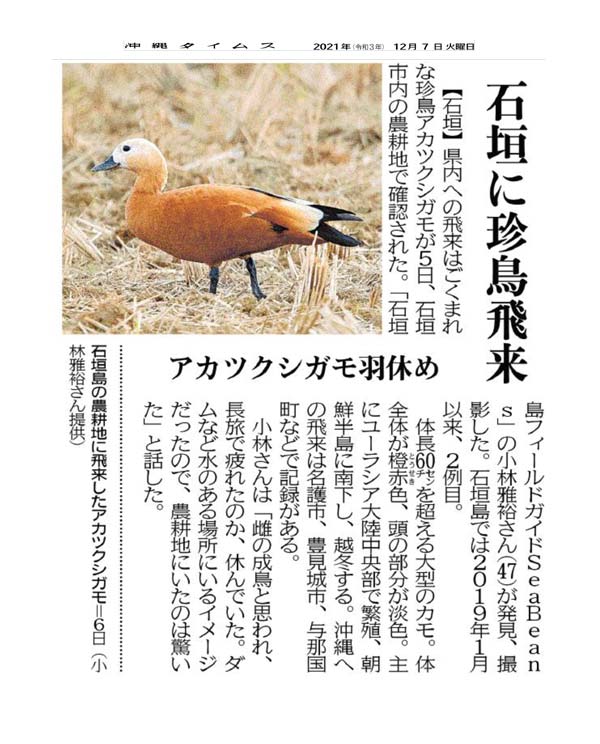 A very rare bird, the Ruddy shelduck, which rarely flies to Okinawa Prefecture, was sighted in farmland in Ishigaki City on the 5th. Mr. Masahiro Kobayashi, 47, of the Ishigaki Island field guide shop “SeaBeans,” found and photographed it. This is the second case in Ishigaki Island since January 2019. It is a large duck, over 60 centimeters long. Its entire body is orange-red, and the head is light-colored. It breeds mainly in central Eurasia. It migrates south to the Korean Peninsula and spends winters there. There are records of them flying to Okinawa in Nago City, Tomigusuku City or Yonaguni Town. Mr. Kobayashi said, “It seemed to be an adult female bird, and was resting, probably tired from its long journey. It surprised me to discover it in farmland because I had a mental image of it being in a place such as a dam.”