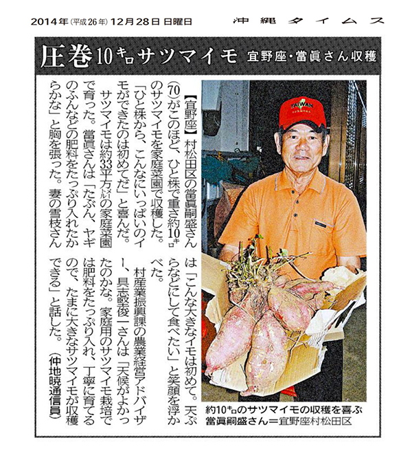 The sweet potatoes grew in his home garden, which measures about 33 square meters. Mr. Toma was proud of his sweet potatoes, saying, “Maybe it’s because I put in a lot of goat manure and other fertilizers.” His wife Yukie happily said, “I have never seen such large sweet potatoes. I think I will cook them tempura-style.”