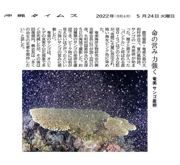 Mr. Katsuki Koh, 51, chairman of the Amami Marine Life Research Association, photographed the event at a depth of five meters off the national highway of Yamato Village, during the nights of March 20th to the 22nd. He was able to confirm the spawning of about ten different types of coral, and at the peak of the spawning season, he could hardly see anything in front of him. “I was impressed by the powerful coral activity.” Much of the coral in Amami Island has died due to crown of thorns starfish, feeding damage, and the bleaching phenomenon, but Chairman Koh said, “I hope that many larvae will be able to be established.”
