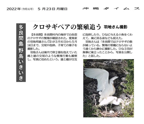 Mr Haneji said, “The number of black-faced spoonbill is decreasing in Tarama. I took these pictures quietly from a distance so as not to disturb their breeding. The three chicks have safely left their nest now, so I decided to share these photos with the public.”
