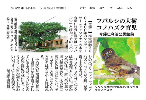 Makoto Yonamine, head of Imadomari-ku, said, “They have been raising their young for a week now. There is a chick in the hollow of a Fuparushi tree. His big round eyes are so cute.”