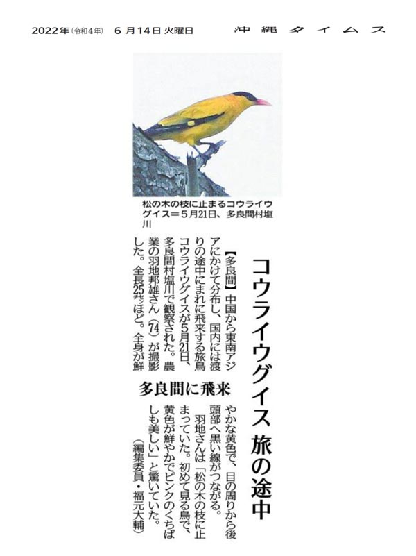 On May 21, a migrating bird, the black-naped oriole, which is found from China to Southeast Asia and rarely flies to Japan during its migration, was observed in Shiokawa, Tarama Village, Okinawa Prefecture. Kunio Haneji, 74, a farmer, took this photo. The bird is about 25 cm in length, its entire body a bright yellow with black lines running from its eyes to the back of its head. Mr. Haneji was surprised when he found it. “It was perched on a pine tree branch,” he said. “I’d never seen this bird before. Its bright yellow color and pink beak are beautiful.”