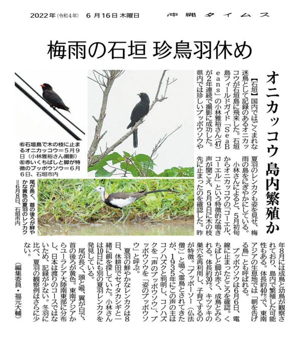 The Asian koel cuckoo, which has been recorded as a rare stray bird in Japan, has recently flown to Ishigaki Island. Mr. Masahiro Kobayashi (47) of “Sea Beans,” a field guide service in Ishigaki Island, successfully photographed it over two consecutive years. The Oriental dollarbird and summer feather pheasant-tailed jacana, rarely seen in the prefecture, also made an appearance, making for a lively time during the rainy season.
