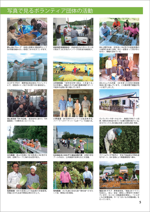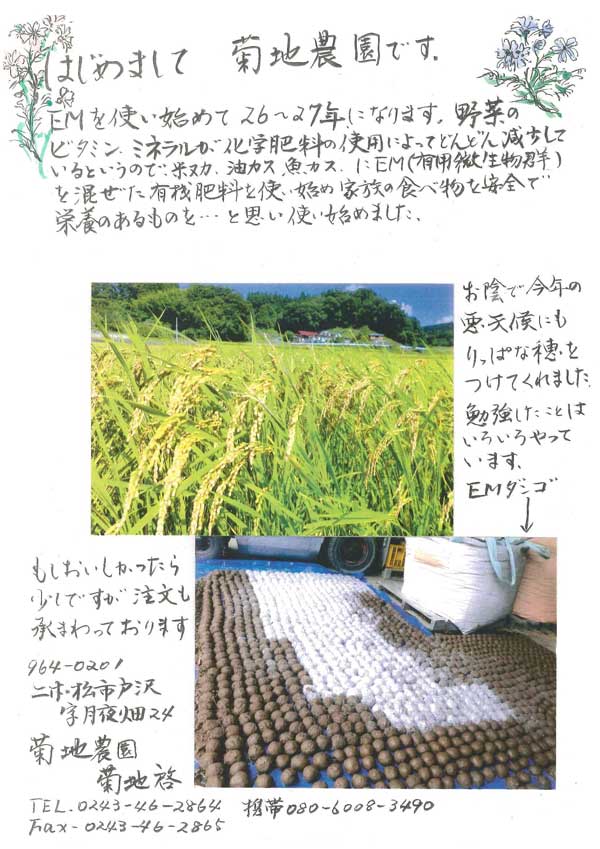 Figure 1 shows the volunteers’ independent efforts to reduce radioactivity. The utilization of EM branches off from each group, has become more widespread, and steady results are being achieved. A part of the activities of currently done by each volunteer group is as shown in the photograph. At the Fukushima Forum, I received rice from the Kikuchi Farm (in the center of the photos) that has been cultivated with EM for over 25 years. The rice had the highest hado wave value among over ten samples of rice sent to me this year and I thought it convincingly showed the power of EM. I also got a handmade brochure so I will introduce it as is.