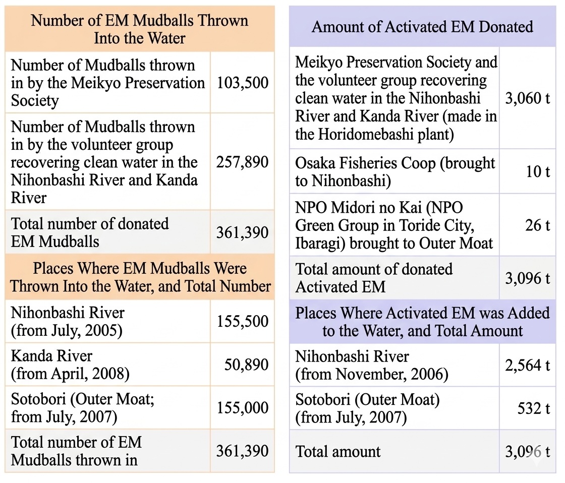 In this connection, below is a list of the amount of Activated EM and numbers of EM Mudballs used in the Nihonbashi River, Kanda River, and Outer Moat (Sotobori) during the period December, 2006-December, 2012.