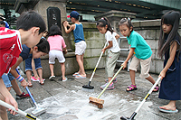 Until recently this scrubbing of the bridge has been done with synthetic detergents, but concern over water pollution led to changing to the use of EM™ Shabondama Soap in 2006. This was the first contact between the Society and EM™, and since then a movement has begun, based on the results shown with the Dotonbori River in Osaka, to clean the water of the Nihonbashi River using EM™. The main funding for this cleanup effort comes from a local volunteer group that is mainly involved with the Historical Bridges Nihonbashi Preservation Society; Chuo Ward and Chiyoda Wards have also cooperated in this effort, while technical advice is provided by U-net (the NPO United Networks for Earth Environment) and EM Sogo Net, and a number of other organizations have also lent their support to the effort.