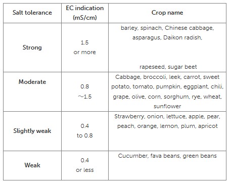 When using a large amount of salt of more than 500 kg per 1,000 m2, it is necessary to refer to the general salt tolerance of the crop shown in the table below, but even if we use EM, salt damage may occur if the EC is two to three times that value.