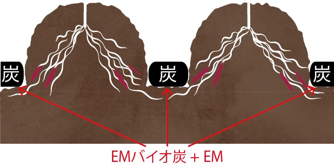 The following is a summary of the results of the application of EM biochar that sweet potato farmers have continued using for three years since 2020. EM materials have been applied at least three times during cultivation every year. The EM used in combination with charcoal in this experiment was activated EM, but the effect is similar when diluted EM・1 concentrate is used.