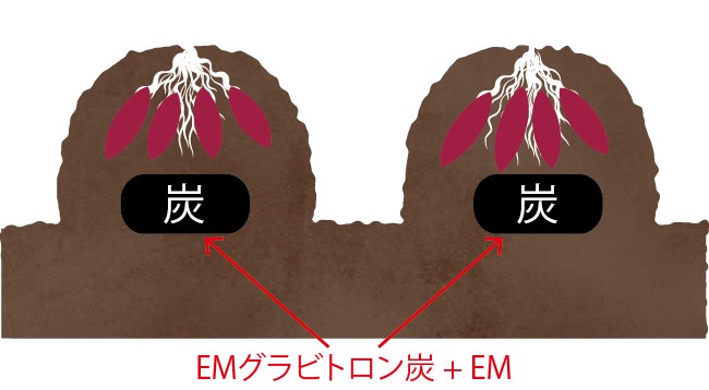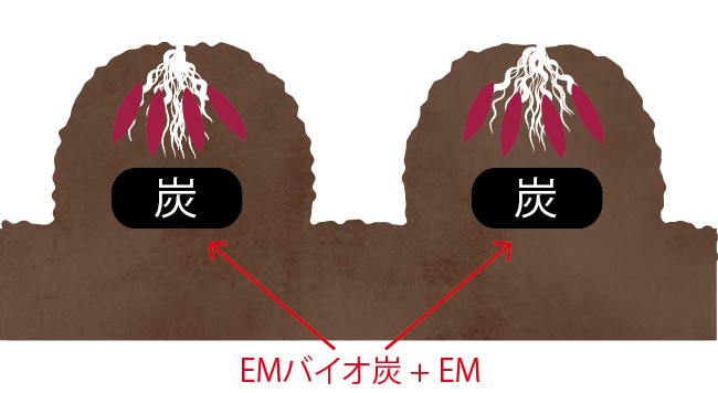 • The ridges were prepared so that the EM Gravitron charcoal and activated EM were near the sweet potatoes’ roots.