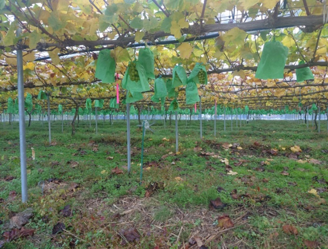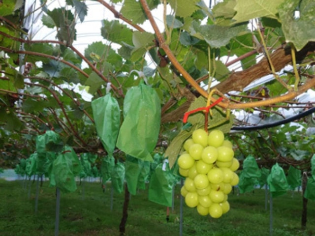 We cover our grapes with bags at the end of July every year to protect them from pests, and then harvest them out of season from October to the end of November. We place activated EM in plastic bottles every 2 meters and bury EM bokashi balls in the ground every meter to enclose the orchard. This year we had no bird or animal damage, though a badger that entered through the drainage pipe did eat some grapes.