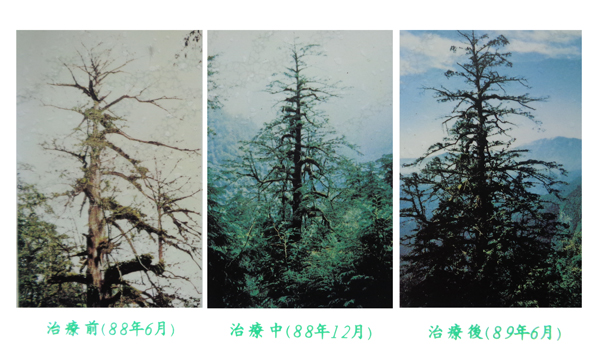 The definitive case of the revival of an old tree by EM technology dates back to 1988. A sacred tree (Confucius tree, over 2500 years old) of the Formosan red cypress in the northern part of the Taiwan mountains (Hualien) had begun to die (see the photo on the left), and I was asked if EM technology could do something about it.