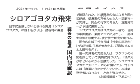 On January 8th a male Savanna Nightjar, a wild bird believed to be non-indigenous in Japan, was spotted on a farm road in Yomitan Village. According to the Okinawa Wild Bird Society, this is the first record of the bird in Japan. It was discovered by bird enthusiast, Mr. Daisuke Noumi of Naha City, and photographed on the 9th by Mr. Kazuki Takeshita, a member of the same association in Ginowan City.