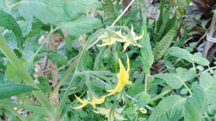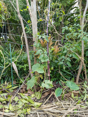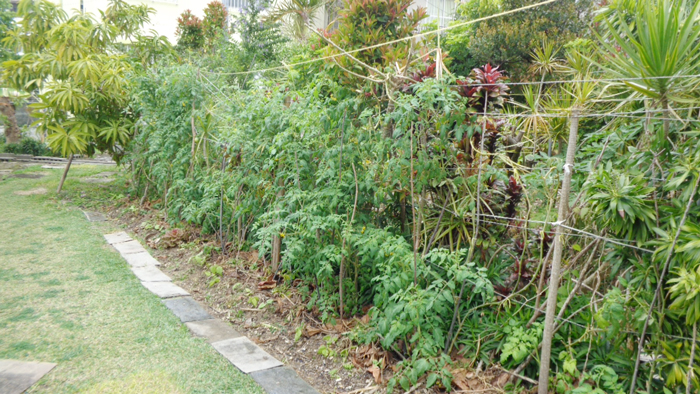 In April, temperatures in Okinawa suddenly rose to summer levels and several days of torrential rain left the ground soggy and the tomatoes started to droop. Since I grow my tomatoes and others in the open-air, they could not cope with the sudden change in the weather, so I planted cucumbers, my next crop, between the tomatoes.