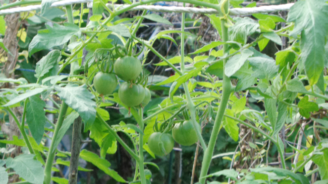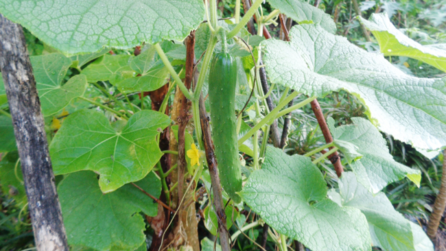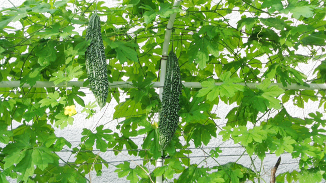 Three months after the typhoon, tomatoes show no evidence of any virus and are beginning to bear abundant fruit (Photo 2). The main branch of the cucumbers has completed its joint formation, and the side branches are heavily laden with fruit (Photo 3). The same goes for Goya, bitter gourd, which is now bearing fruit on second generation vines (Photo 4).