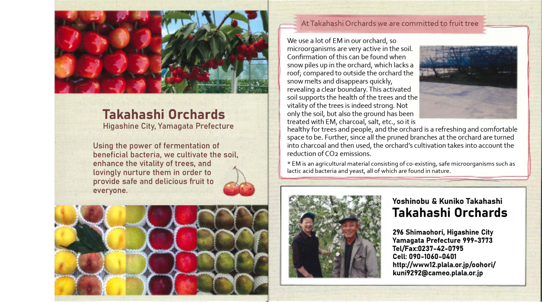 The use of EM charcoal made with smokeless carbonizers, which began seven years ago, has achieved steady results. Takahashi Orchard in Higashine Ciy, Yamagata Prefecture, which started six years ago, has also overcome various difficulties and has now put out brochures touting their full confidence in this technology.