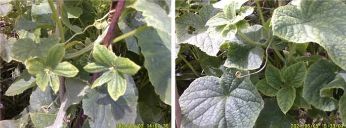 In my experience, if the rainy season continues like this, plants would frequently suffer root rot, standing wilt, and downy mildew and recovery would be almost impossible, yet by applying an additional 30 to 40g of EM Gravitron charcoal around the roots, the cucumbers are growing healthily. However, the fruits stopped growing due to blistering and split stems, resulting in a meager harvest. The female flowers that were blooming turned into green vegetative bodies one after another (Photo 3 and 4), and there was no new harvest. The rainy season let up for a few days, however, which allowed the plants to recover their vigor, and many third-generation shoots appeared (Photo 5).