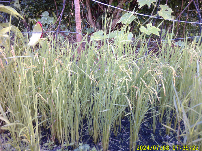 Starting this year (2024), I’ve been working on self-sufficient rice cultivation that will yield a harvest all year round. At the end of the year, I applied 200 kg of salt and 50 kg of EM Bokashi per 10 ares on the dry rice field, and after a week, I filled the field with shallow water, weeding and improving the soil, and directly sowed germinated rice on January 20. The rice steadily grew from around mid-February, and the first harvest was offered on the 1st of July (Photo 3).