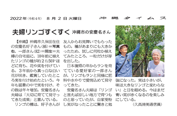 Mrs. Yoshiko Agena, 86, on the right and Mr. Ichiro Agena, 82, who live in Kubota, Okinawa City, planted some apple seeds ten years ago in their garden and one of them has grown to a height of about 2.5 meters and is now flowering and bearing fruit. The pure white blossoms bloomed three years ago, and while they were enjoying them, the tree began to bear fruit. This year, too, it bore apples even in the intense heat, and the number of apples has been increasing every year. Mr. and Mrs. Agena are happy with the results of their efforts to carefully nurture and watch over the tree.